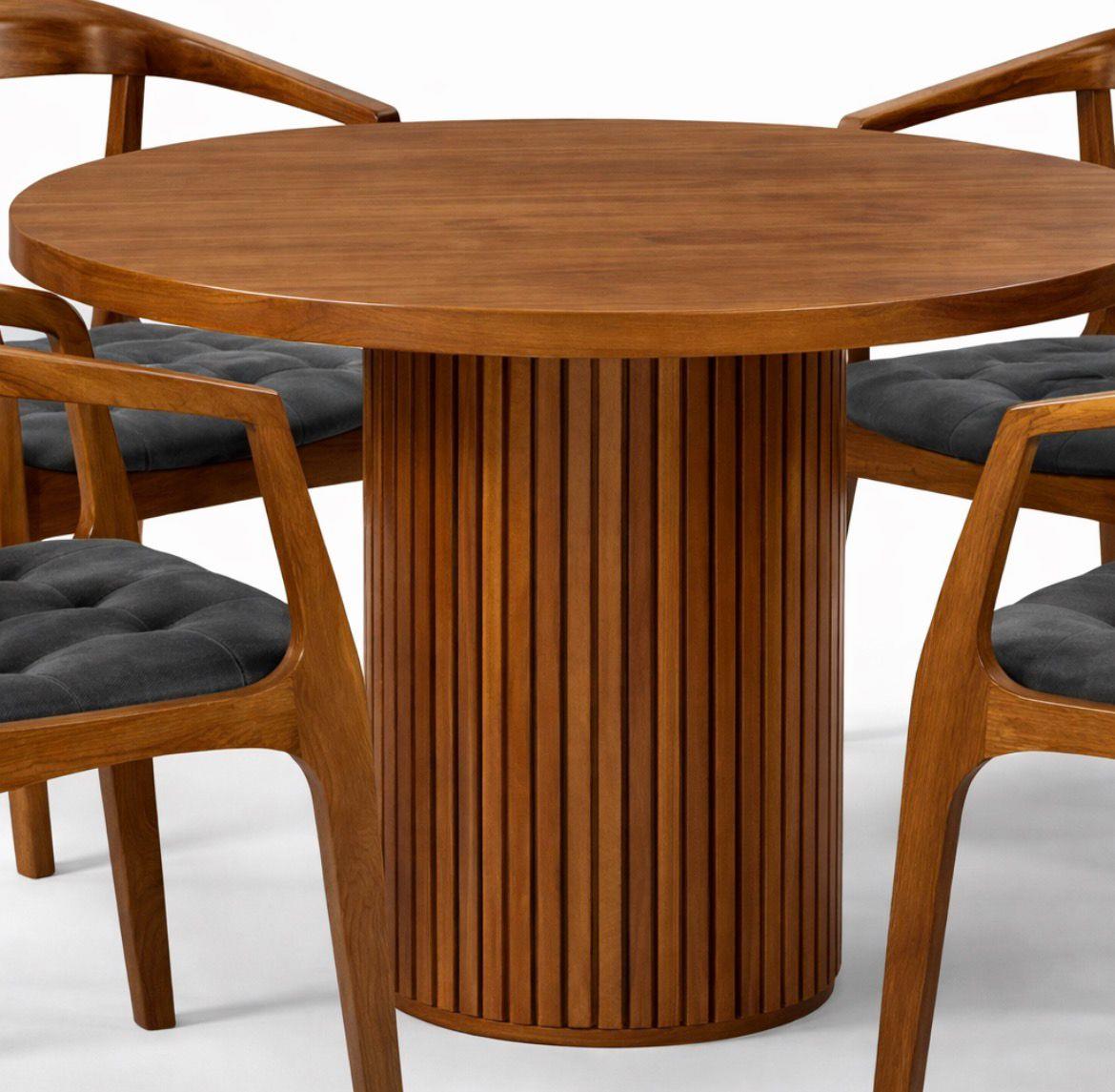 Bu 100x100 cm yuvarlak yemek masası takımı, doğal ahşap dokusu ve dengeli ölçüleriyle yaşam alanlarında fonksiyonel ve şık bir kullanım sunar. Masa üst tablası kayın ağacı kaplamalı MDF olarak üretilmiş olup günlük kullanıma uygun, dayanıklı ve kolay temizlenebilir bir yapıya sahiptir. Ahşap kayın ayaklı, çıtalı silindir formdaki masa ayağı tasarımı hem estetik görünüm hem de yüksek denge sağlar.