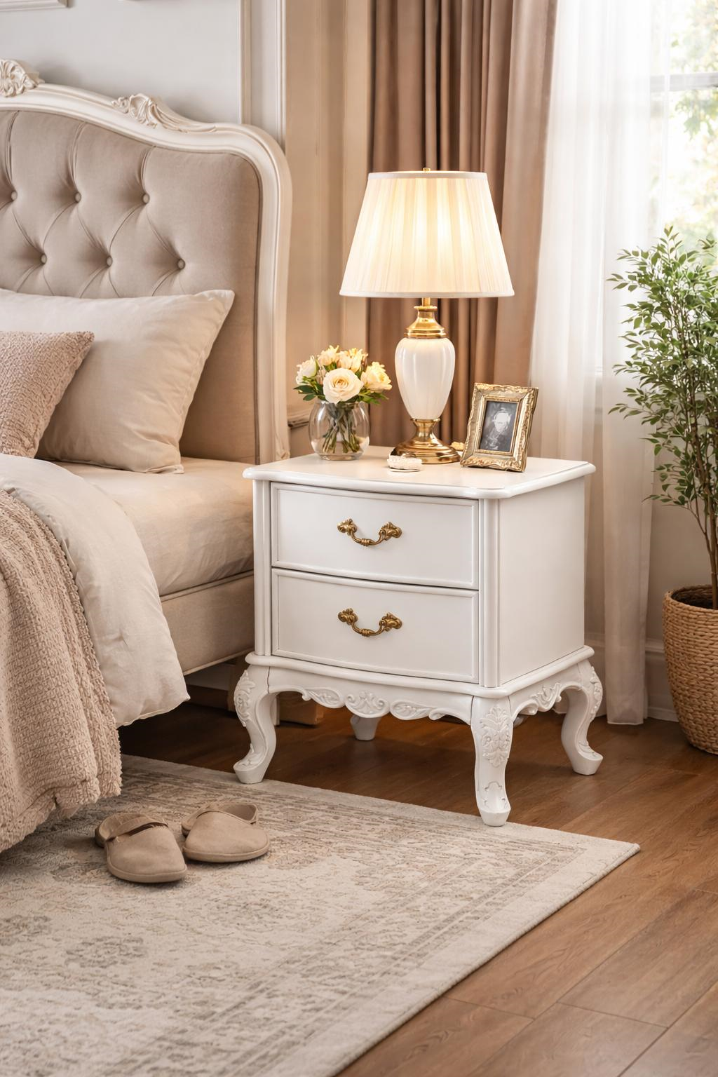 Zamansız klasik tasarımı ve estetik oymalı detaylarıyla dikkat çeken bu 2 çekmeceli komodin, yaşam alanlarına şıklık ve zarafet katar.