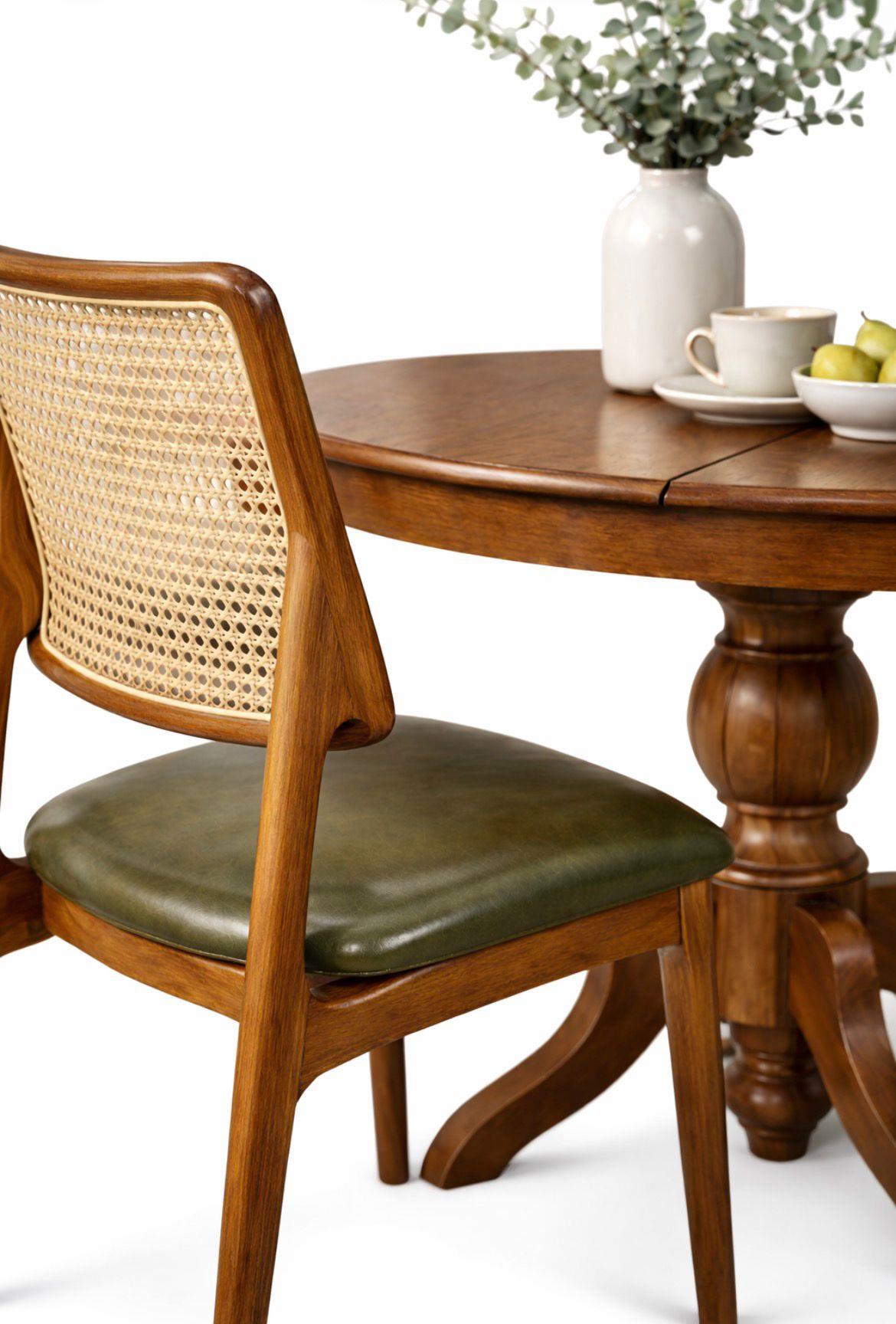 Masanın ayakları masif ahşaptan üretilmiş olup sağlam ve dengeli bir duruş sağlar. Üst tabla ahşap kaplamalı MDF’dir; hem şık görünüm hem de uzun ömürlü kullanım için ideal yapıdadır. Takım içerisindeki 4 adet sandalye, masa ile uyumlu tasarım diliyle kombinlenmiştir. Farklı oturum alternatifleri için sandalye & berjer modellerine göz atabilirsiniz.