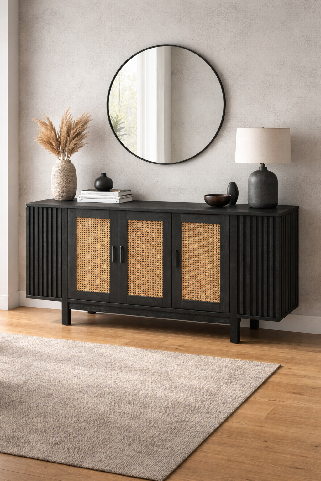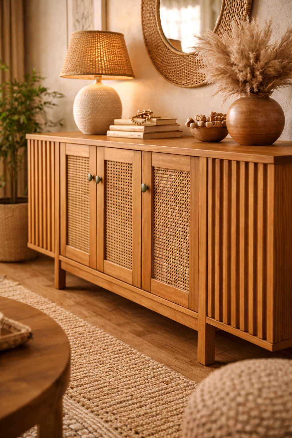 Hasır kapaklı ahşap konsol, modern ve doğal dekorasyon trendlerine uyum sağlayan zamansız bir tasarıma sahiptir. 180 cm genişliği sayesinde salonlarda konsol, TV altı ünitesi veya antre depolama dolabı olarak rahatlıkla kullanılabilir. Dikey ahşap detayları ürüne mimari bir derinlik kazandırır. Ürün, depolama üniteleri koleksiyonunda doğal şıklığıyla öne çıkar.
