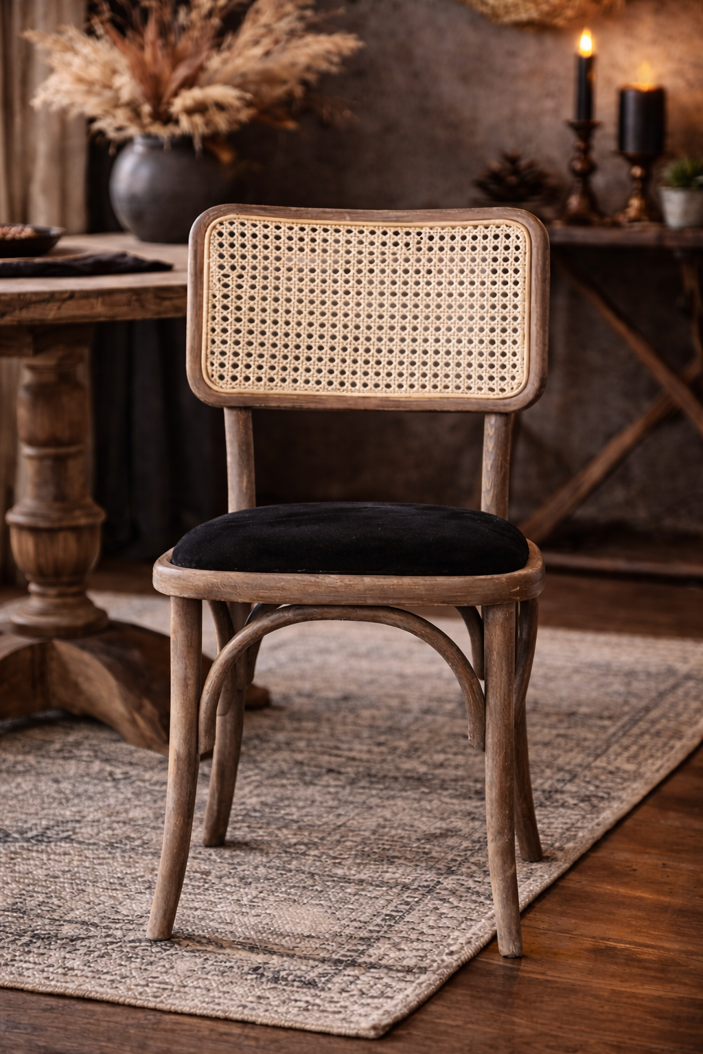 Sırt bölümünde yer alan krem renkli hazeran detay, sandalyeye doğal ve zarif bir görünüm kazandırır. Hazeran örgü, nefes alabilen yapısıyla yalnızca estetik değil, aynı zamanda fonksiyonel bir kullanım sunar. Eskitme yüzey dokusu, ahşabın doğal damarlarını ön plana çıkararak her ürünün kendine özgü bir karakter taşımasını sağlar.