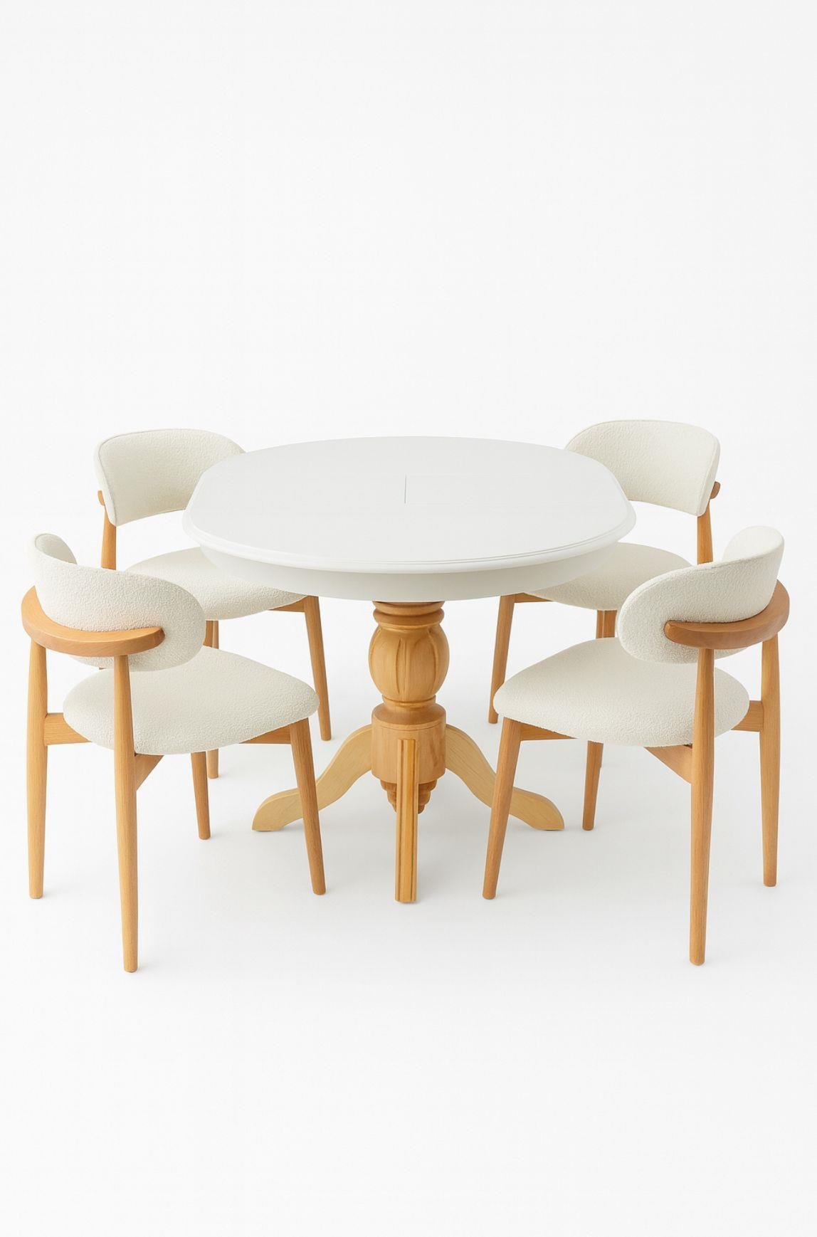 Masa ölçüsü 100×100 cm olup, açıldığında 100×135 cm oval forma dönüşür. Masanın gövdesi ve ayağı tamamen masif ağaçtan üretilmiştir; sağlam yapısı sayesinde uzun ömürlü ve dengeli kullanım sunar. Kurulumu ustalık gerektirmez – kullanıma hazır hâle kolayca getirilir.