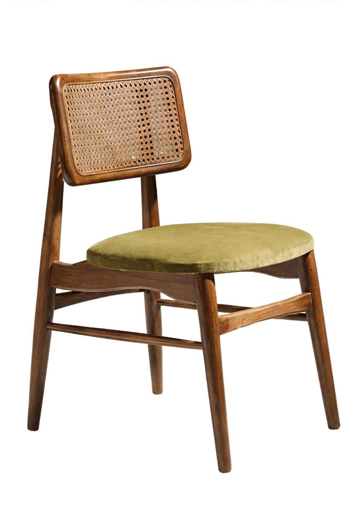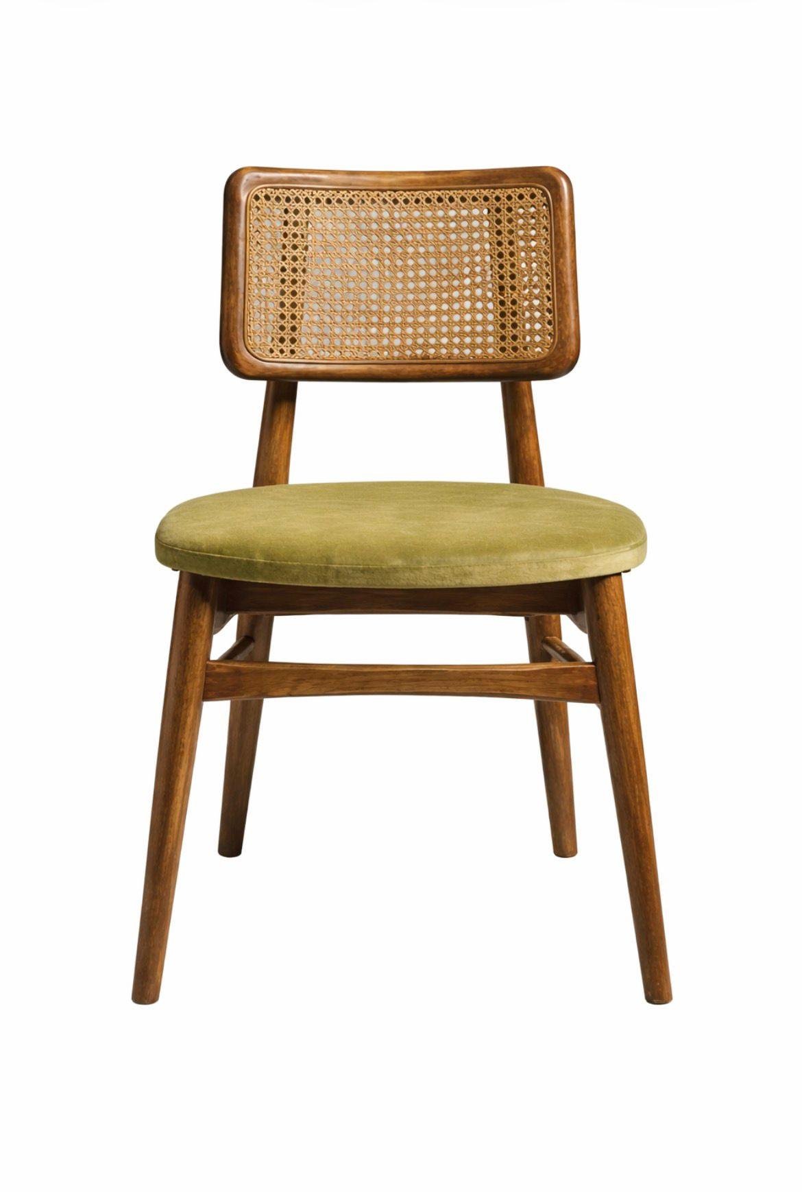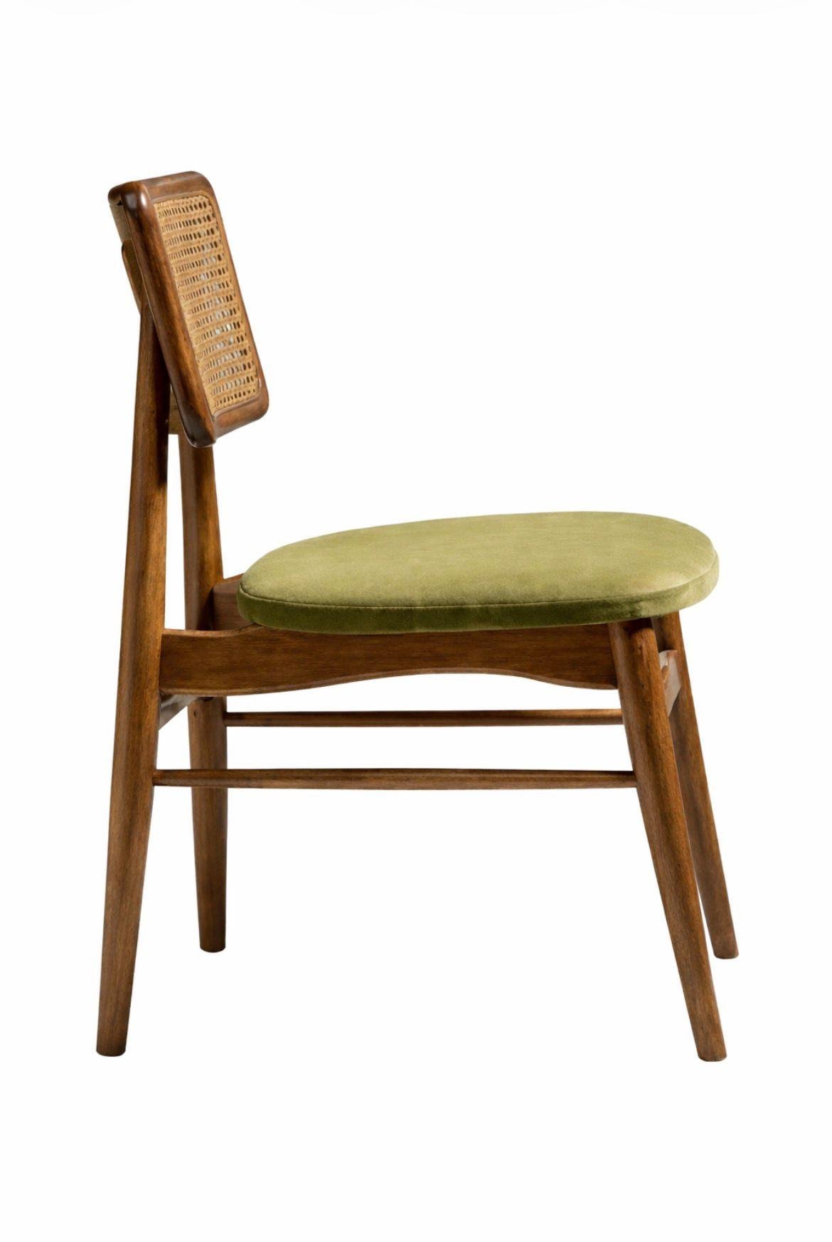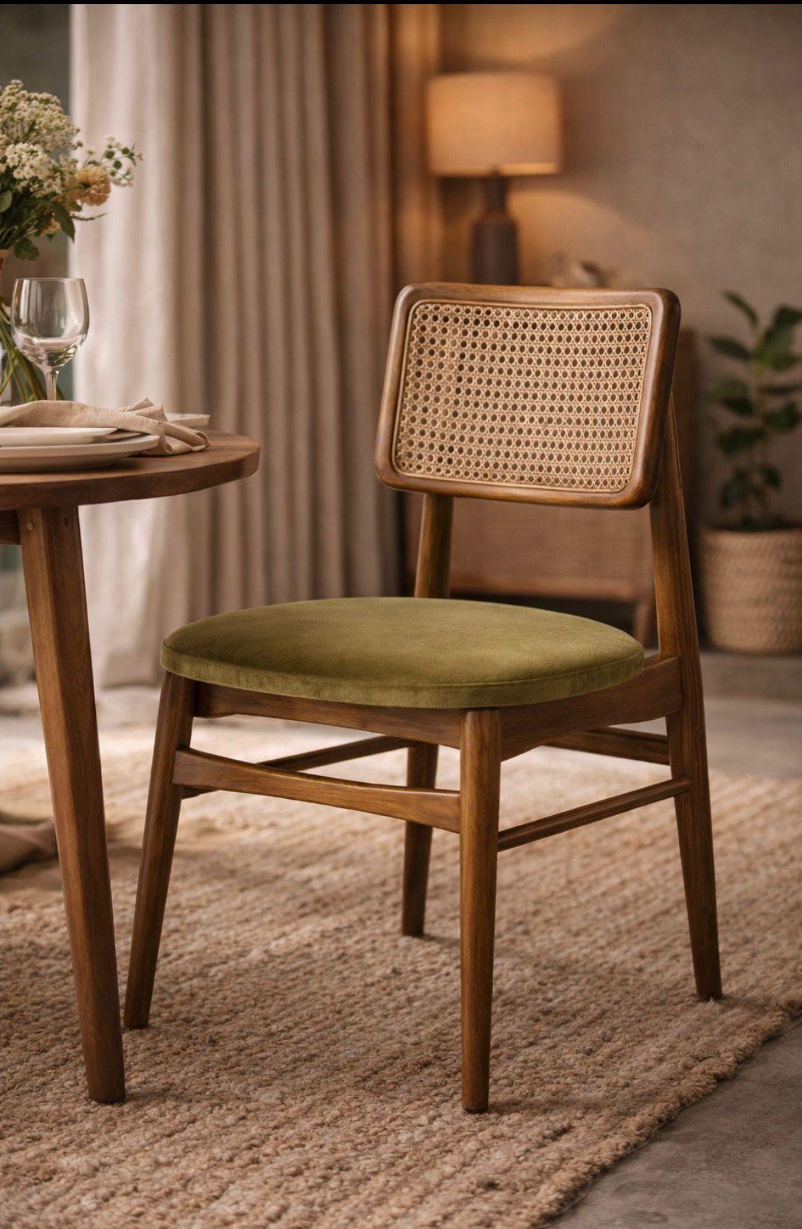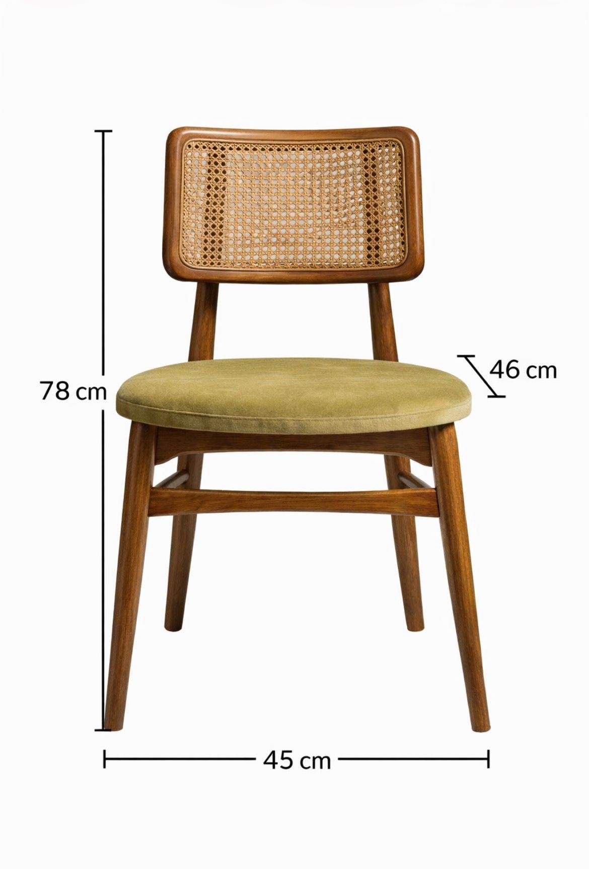 Sırt kısmında kullanılan hazeran (hasır / kafes) örgü, hem nefes alabilen bir yapı sunar hem de sandalyeye hafif ve zarif bir görünüm kazandırır. Oturum kısmı ergonomik ölçülerle tasarlanmış olup uzun süreli kullanımlarda konfor sağlar. Yemek masası takımları ile birlikte kullanıldığında mekânda estetik bir bütünlük oluşturur.