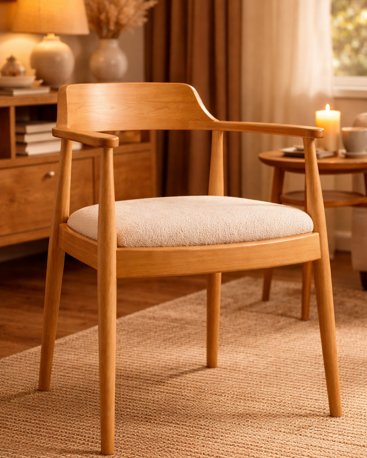 Kerben Natural Kayın Ahşap Kolçaklı Sandalye, günlük kullanım ihtiyaçları göz önünde bulundurularak tasarlanmıştır. Kolçaklı yapısı, oturum sırasında kullanıcıya ek destek sağlar. Oturma alanı ölçüleri, masa etrafında uzun süreli kullanımlarda rahatlık sunacak şekilde dengelenmiştir. Yemek sandalyesi olarak kullanıldığında hem dik hem de doğal bir oturma pozisyonu sağlar. Ergonomik formu, konforu abartmadan fonksiyonel bir denge kurar.