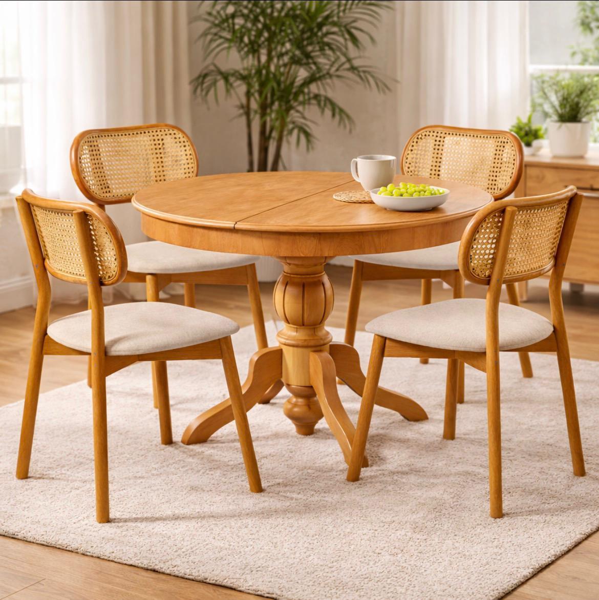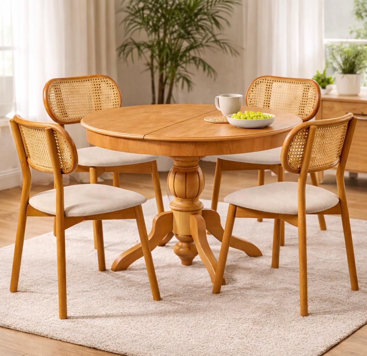 Doğal ahşap dokusu ve zamansız tasarımıyla öne çıkan bu yemek masası takımı, mutfak ve yemek alanlarında hem estetik hem de fonksiyonel bir kullanım sunar. Yuvarlak masa formu sayesinde alanı dengeli kullanmanızı sağlarken, açılır mekanizması ile ihtiyaç anında daha geniş bir sofraya dönüşür.