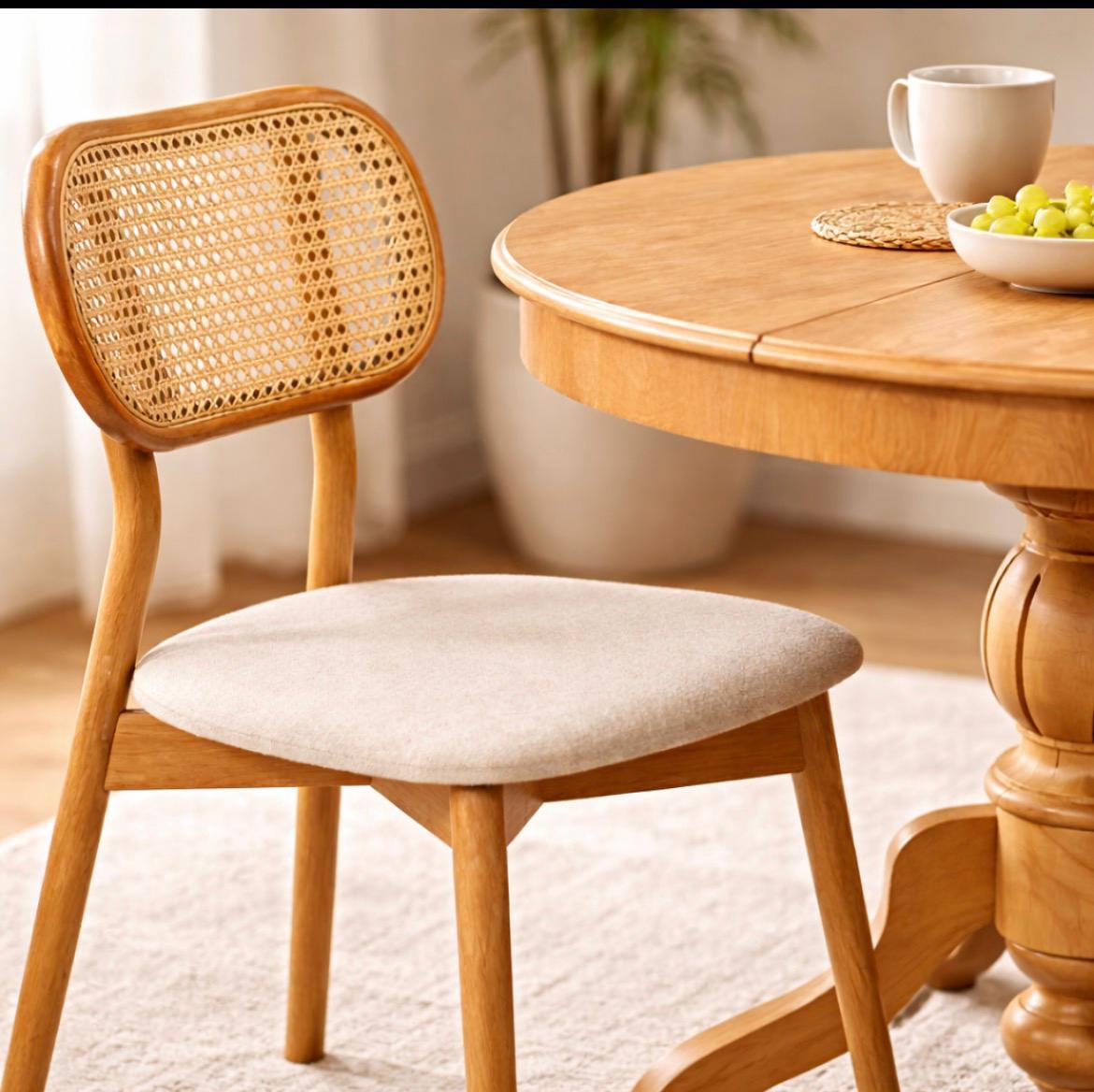 Takımda yer alan sandalyeler; doğal hasır sırt yapısı ve döşemeli oturum alanı sayesinde konforu estetikle birleştirir. Kayın ağacından üretilen sağlam iskelet yapısı, uzun ömürlü ve dengeli bir kullanım sunar. Naturel ahşap tonu sayesinde modern, bohem ve klasik dekorasyon stilleriyle kolayca uyum sağlar.