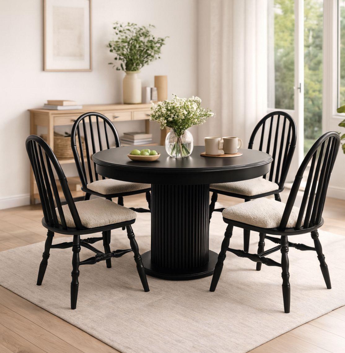 Bu şık ve modern siyah açılır yuvarlak masa takımı, hem fonksiyonelliği hem de el işçiliğini bir araya getirerek mutfak ve yemek alanlarında fark yaratmak isteyenler için özel olarak tasarlanmıştır.