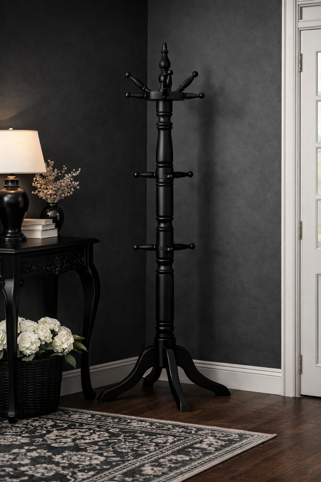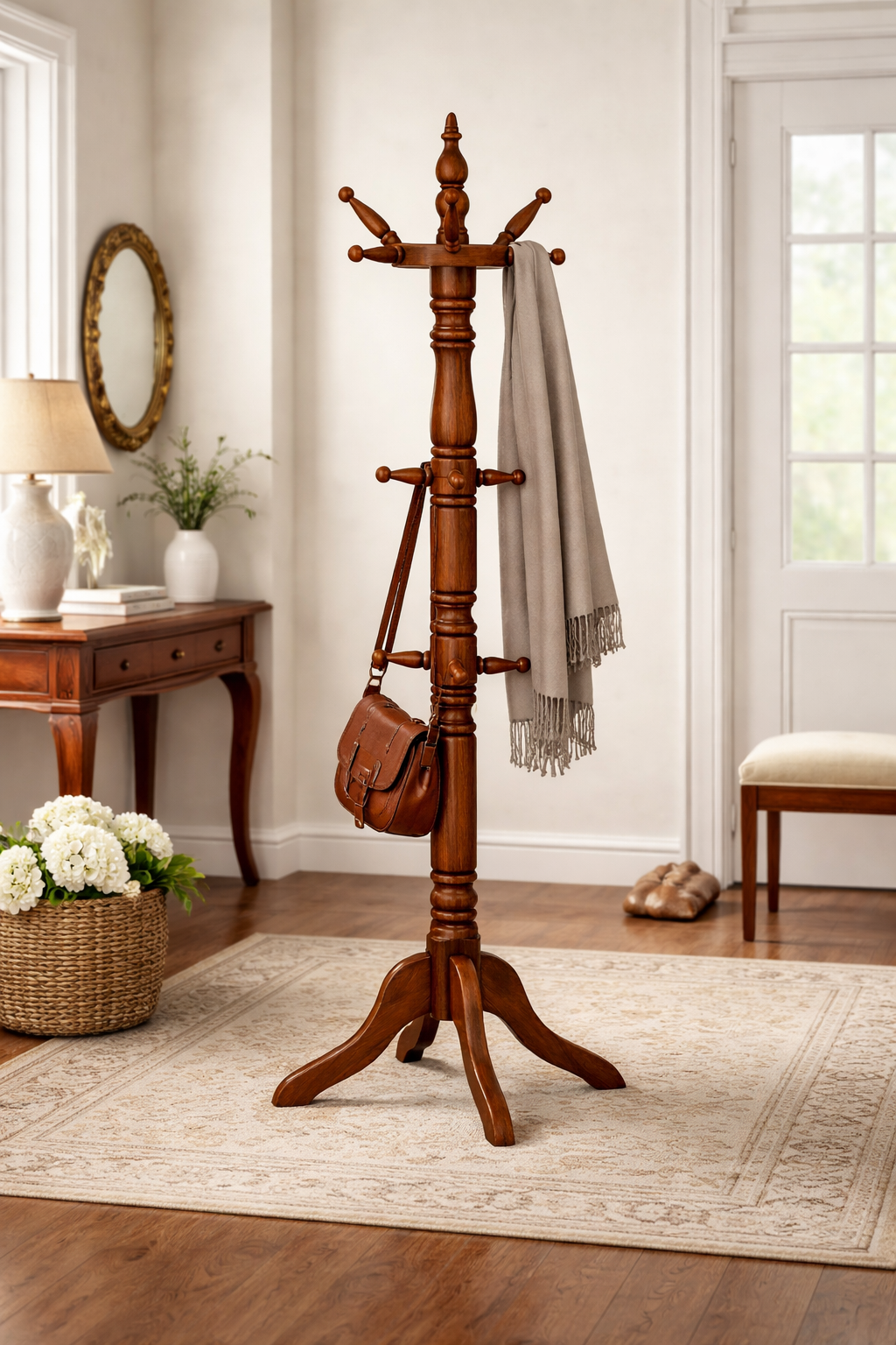 Ayaklı ahşap askılık, 176 cm yüksekliği, dengeli ayak yapısı ve çoklu askı kolları ile günlük kullanımda maksimum konfor sunar. Torna detaylı gövdesi, ürüne klasik ve zamansız bir karakter kazandırarak antre mobilyaları, butik dekorasyon ürünleri ve dresuar kombinleriyle birlikte şık bir giriş alanı oluşturur.