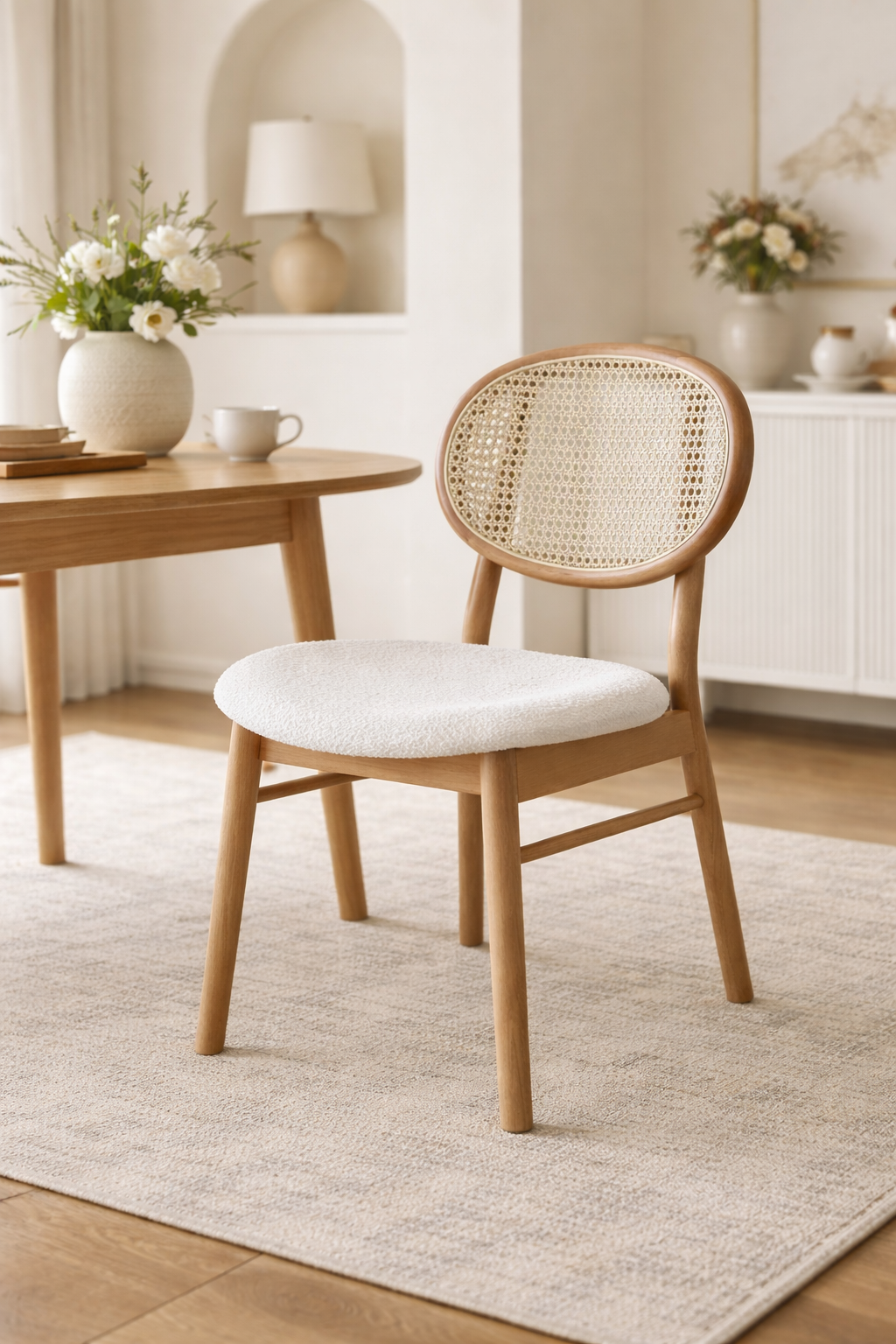 Kafe ve restoran gibi ticari alanlarda da tercih edilebilecek bu sandalye, hem estetik görünümü hem de sağlam yapısıyla profesyonel kullanıma uygundur. Hasırlı sandalye formu sayesinde mekâna sıcak ve davetkâr bir atmosfer kazandırır.